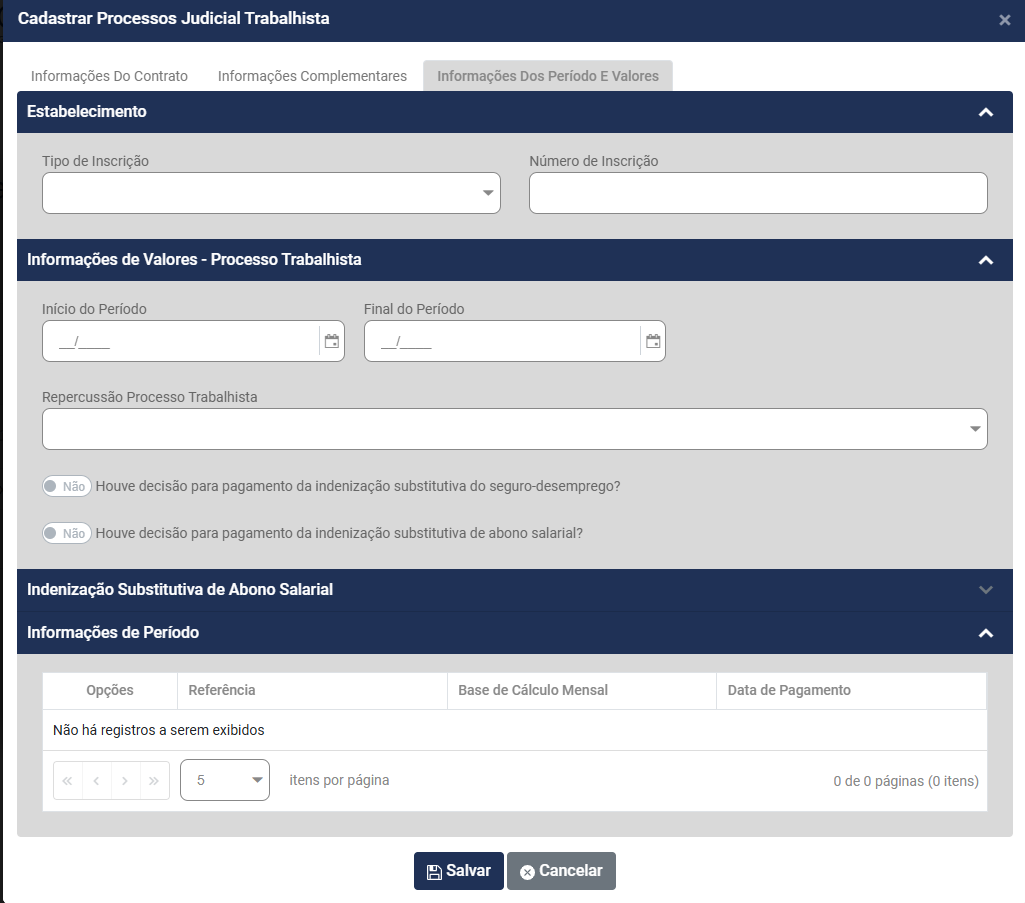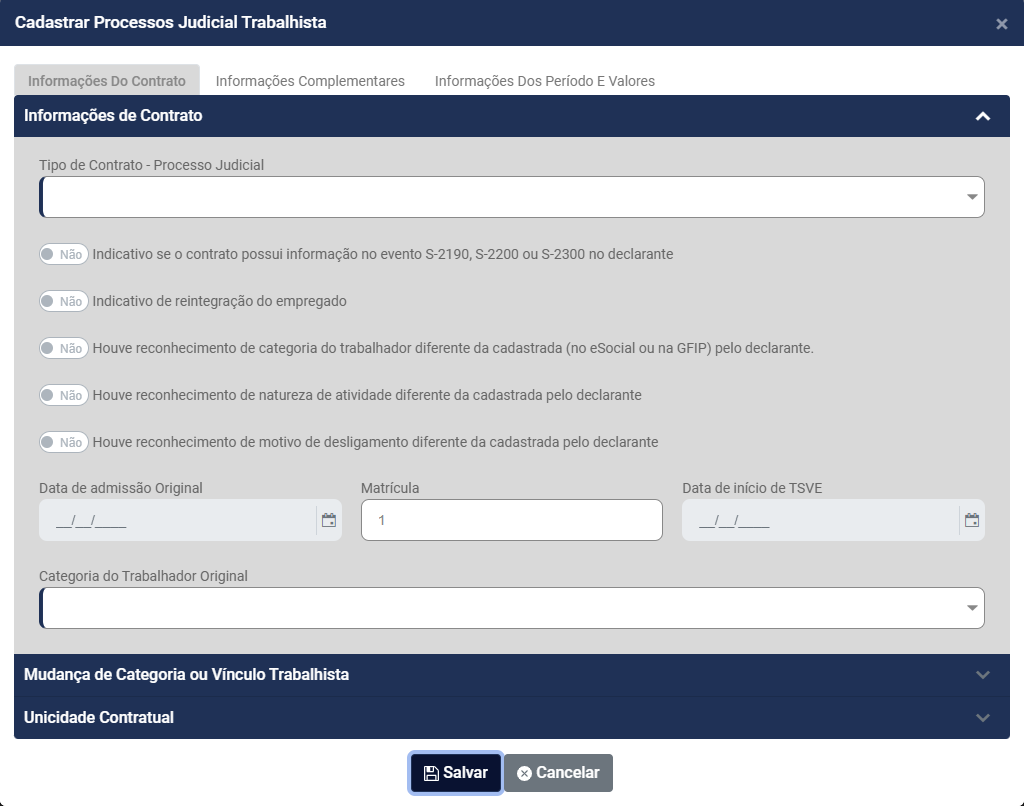 Informe o Tipo de Contrato - Processo Judicial e em seguida defina todas as informações apresentadas na tela