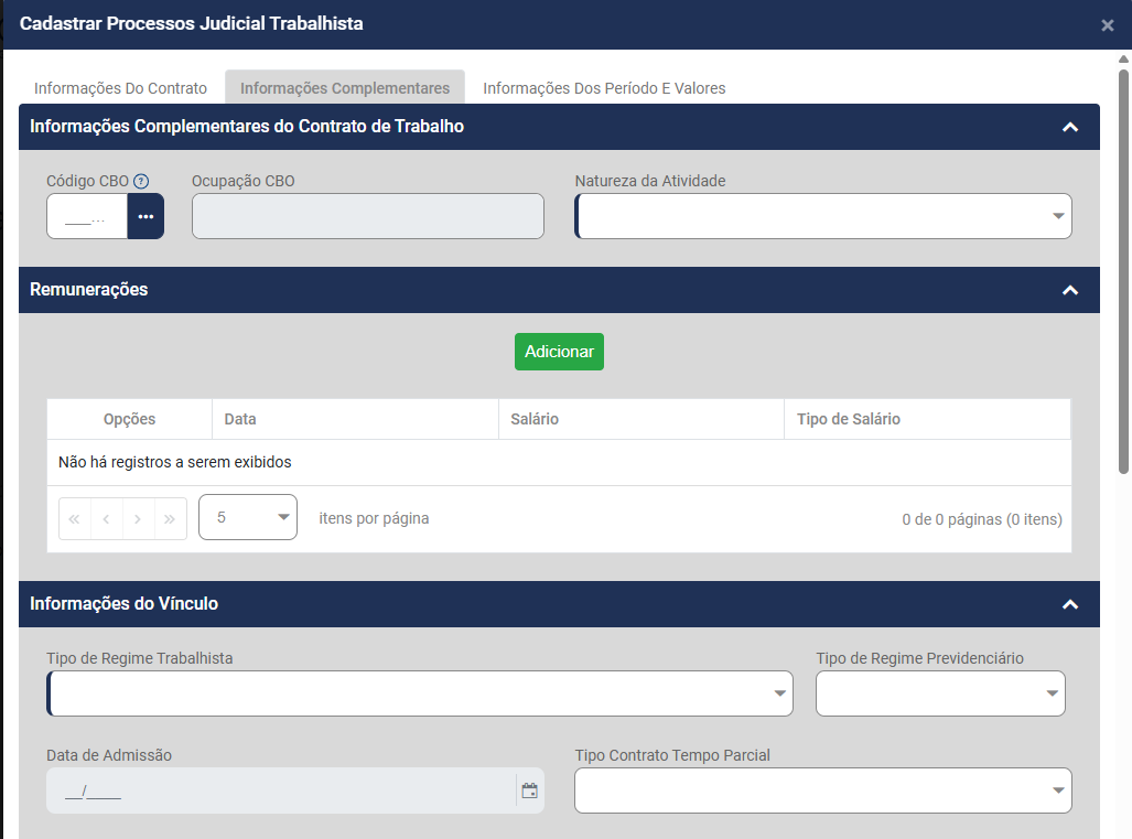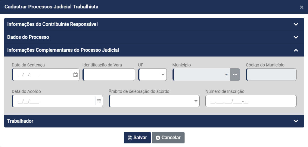 Ao acessar o botão Adicionar será apresentada a tela para cadastro do Processo Trabalhista, com as seguintes informações para serem cadastradas: