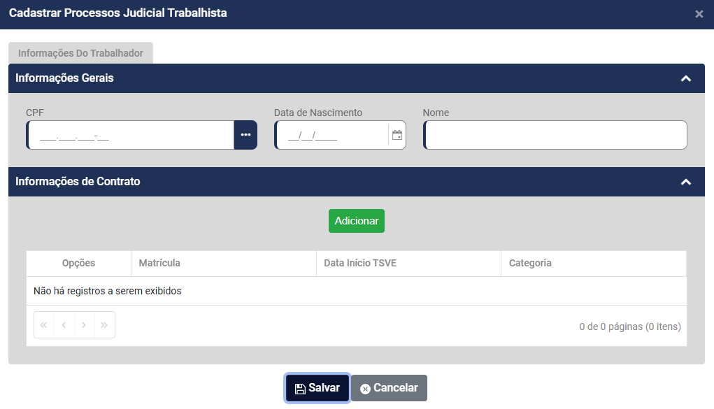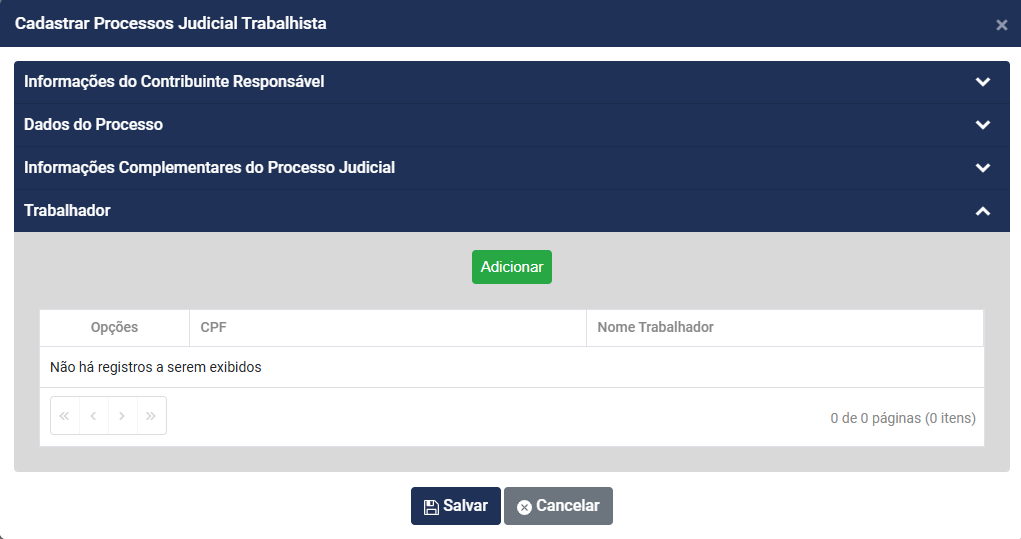 Clique no botão Adicionar para informar os Trabalhadores relacionados ao Processo Trabalhista que está sendo cadastrado, informe