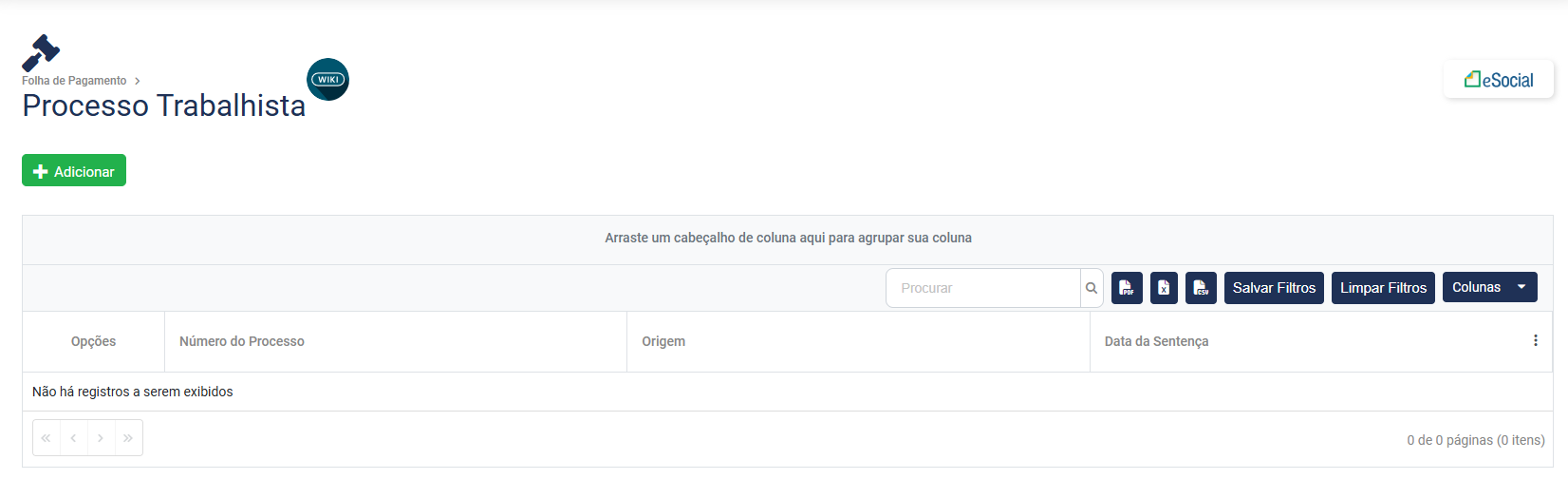 Será apresentada a tela contendo o Grid de cadastros dos Processos Trabalhista, contendo as informações: