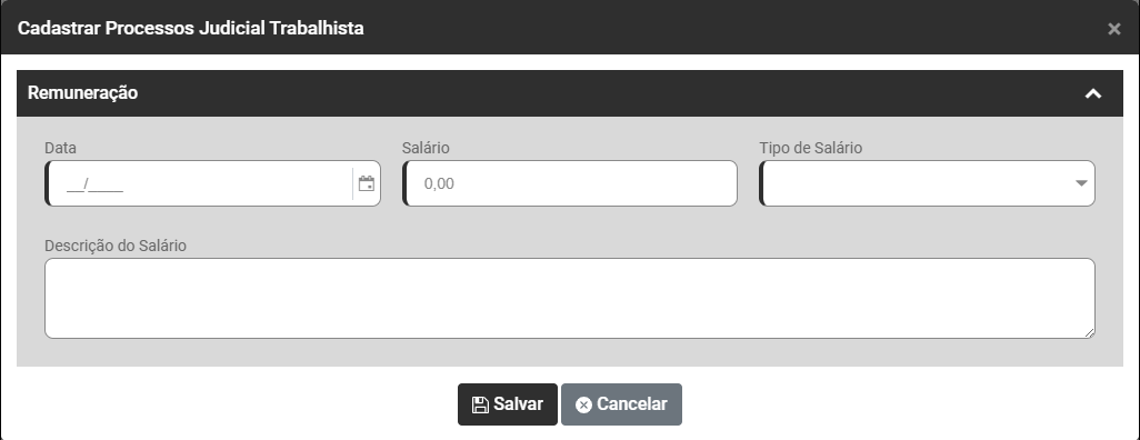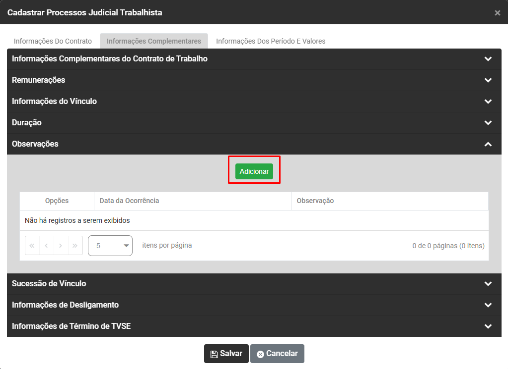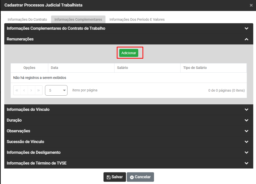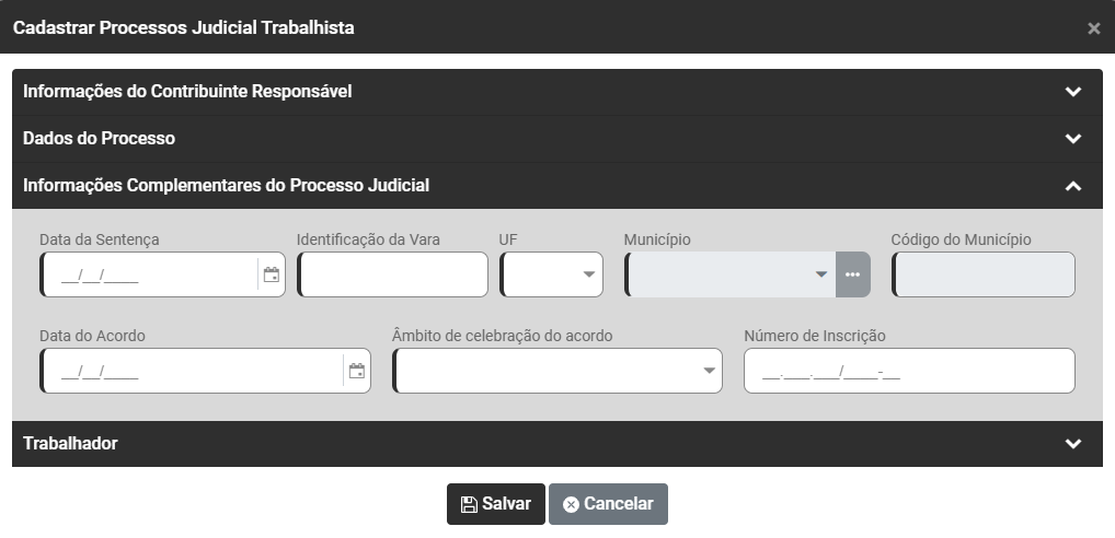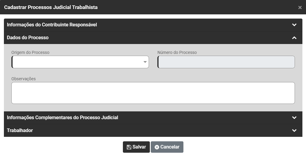 Ao clicar em Adicionar será apresentada a tela para Cadastrar Processo Judicial Trabalhista