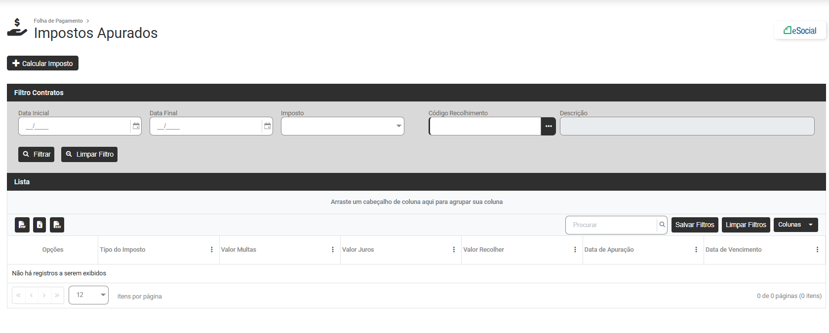 Será apresentada a tela com o Grid de informações dos Impostos Apurados, contendo as informações: