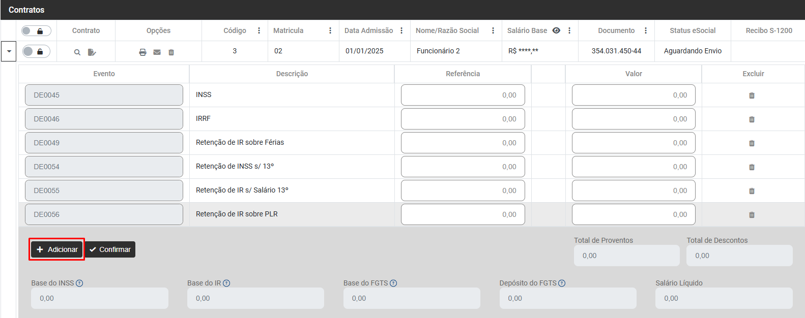 Para incluir eventos que não estão cadastrados no Hollerith Padrão do Funcionário nem em suas Referências Fixas, clique no Botão "Adicionar"