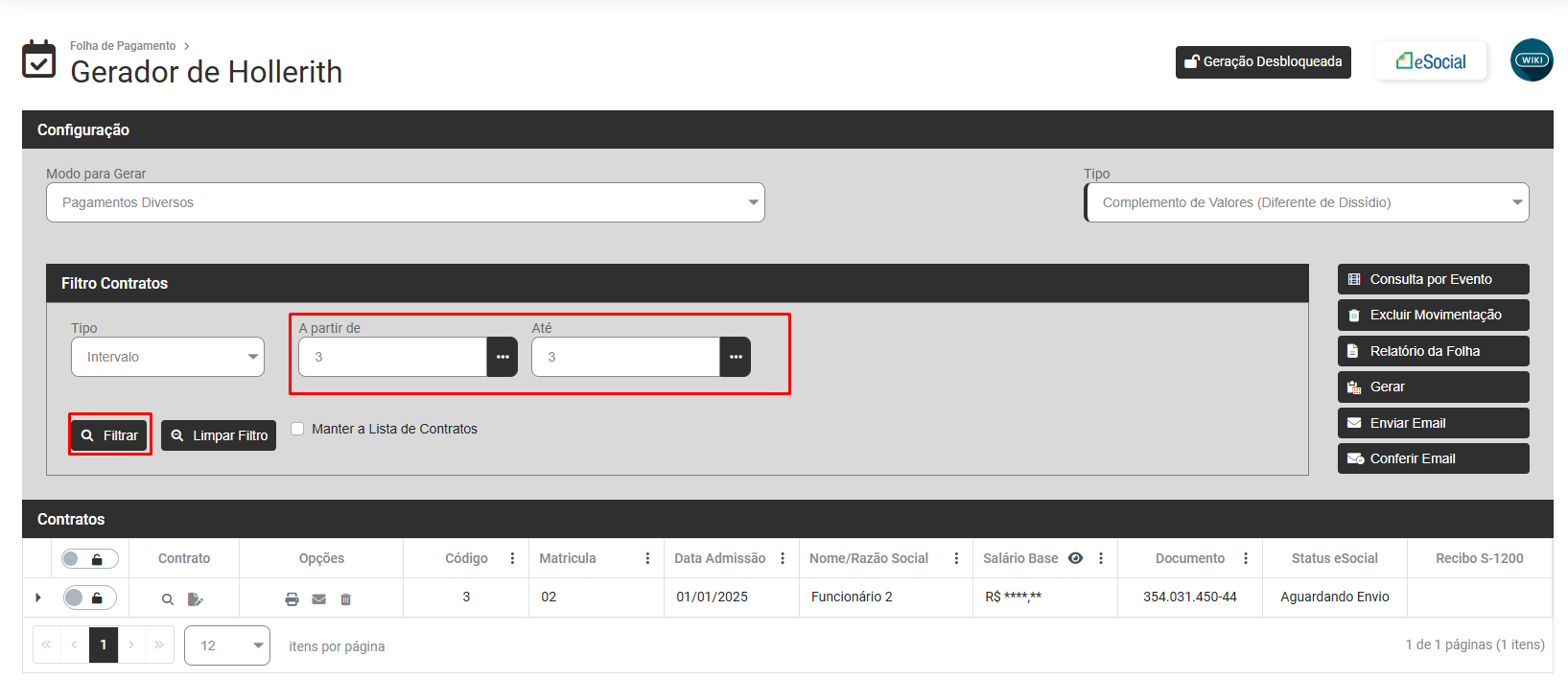 Para a Geração de Pagamento de Intermitente de sua Empresa defina o Modo Intermitente e o Sistema irá apresentar a tela para que você defina o Filtro dos Contratos que terão Pagamento de Intermitente gerados.