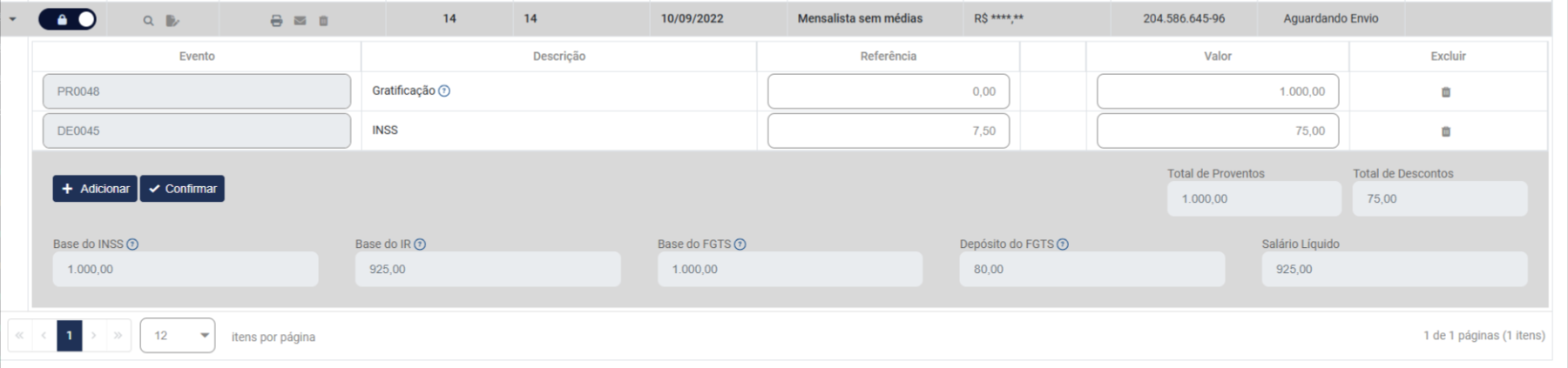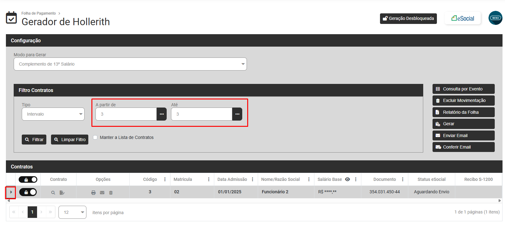 Para visualizar as informações geradas Filtre novamente e expanda as informações através do botão ao lado esquerdo dos dados do funcionário.