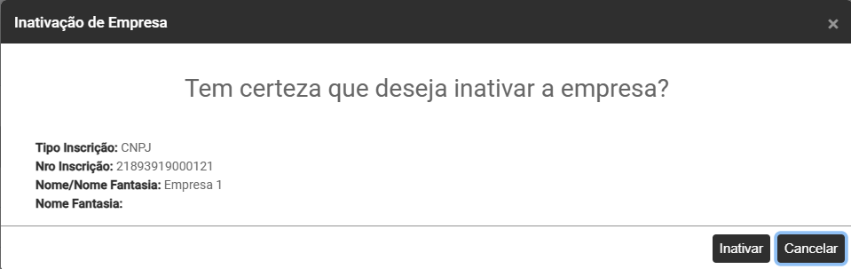 Caso seja necessária a Inativação da Empresa, clique no botão de inativação (desenho do xis) e o Sistema irá questionar se tem certeza que deseja inativa a empresa, clique em inativa