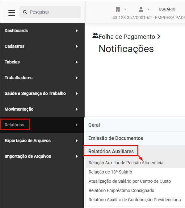 Para imprimir a Relação Auxiliar de Pensão Alimentícia acesse o menu Relatórios>Relatórios Auxiliares>Relação Auxiliar de Pensão Alimentícia
