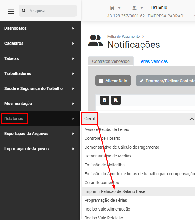 Para imprimir a Relação de Salário Base acesse o menu Folha de Pagamento>Relatórios>Imprimir Relação de Salário Base