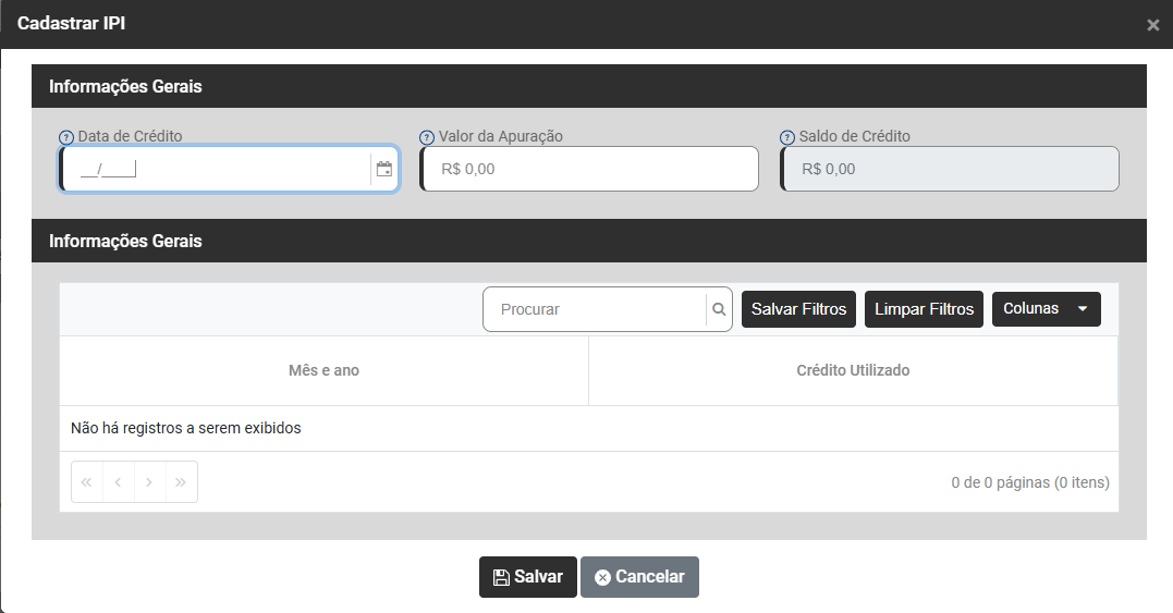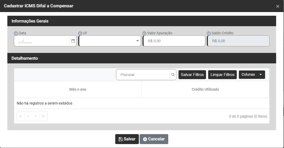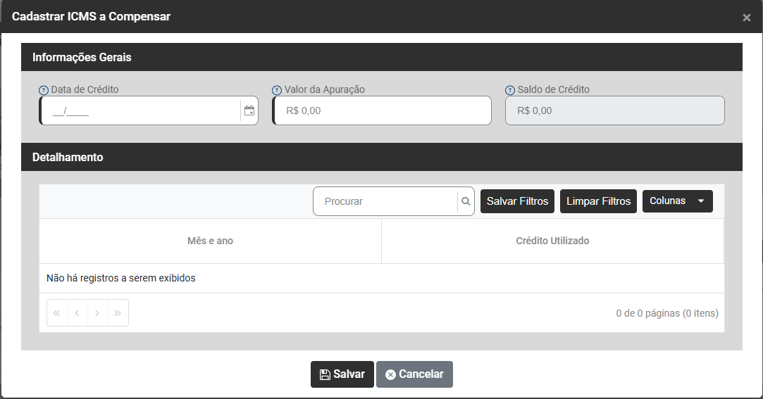 • Saldo de Crédito - O Saldo de Crédito é o resultado da subtração do “Valor Apuração” e Créditos Utilizados