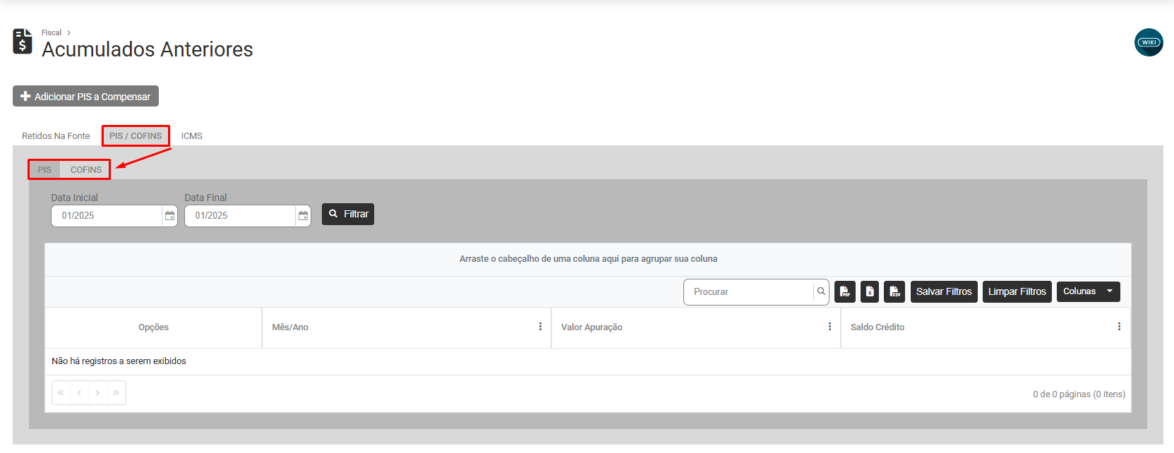 Ao clicar na Aba PIS você encontrará na parte superior da tela o Botão Adicionar PIS a Compensar
