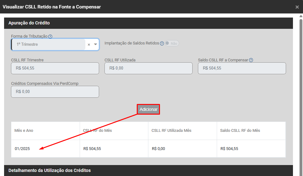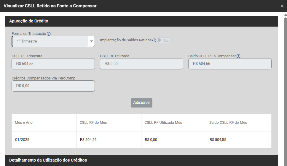 Clique no botão Adicionar CSLL RF a Compensar e informe: