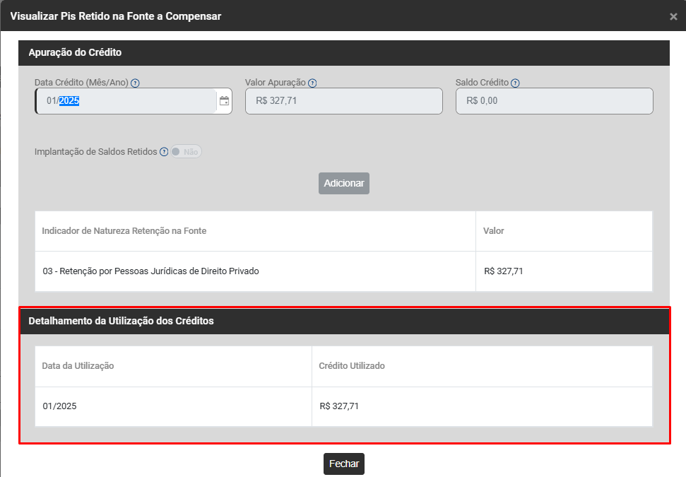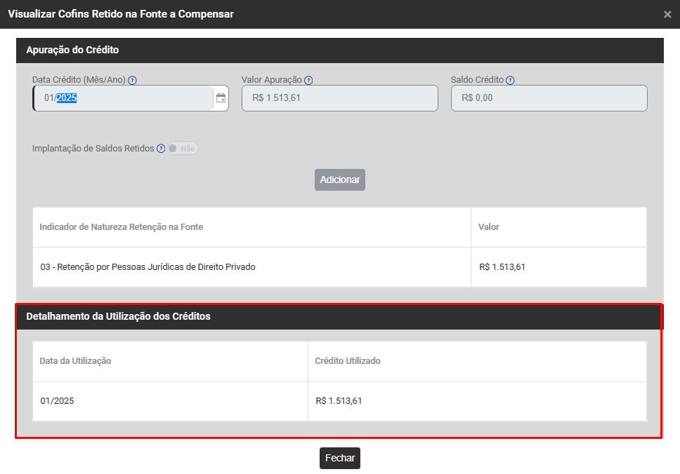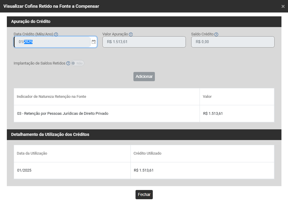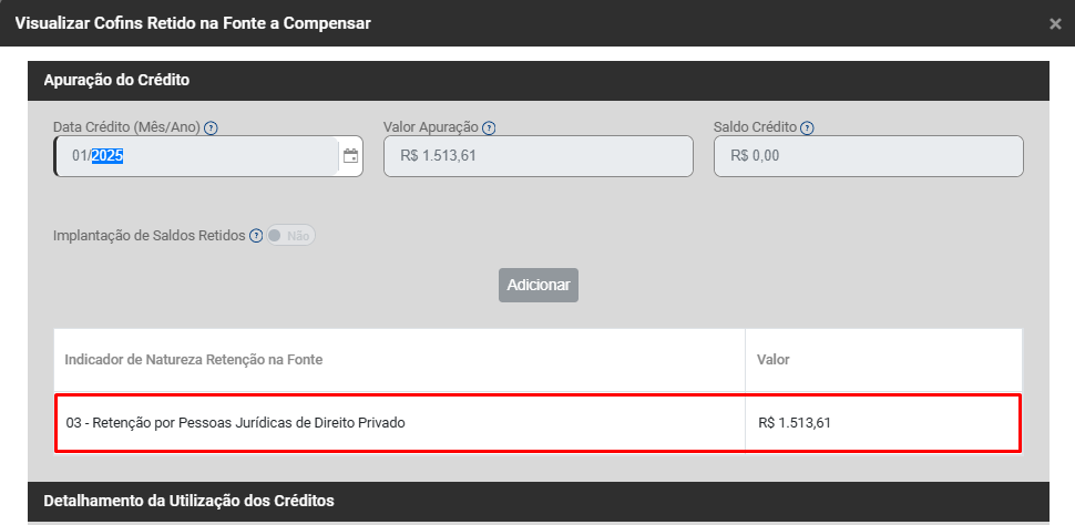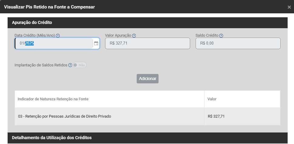 • Saldo Crédito - O Saldo crédito é o resultado da subtração do "Valor Apuração" e "Créditos utilizados". O saldo de retenção a utilizar em períodos de apuração futuros.