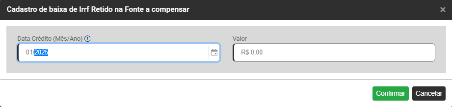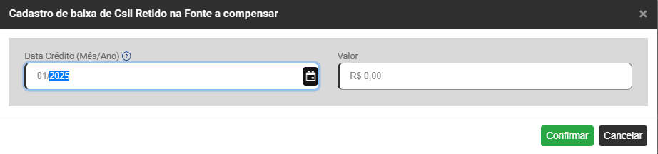 • Data Crédito (Mês/Ano) - Informe neste campo o período do recebimento da retenção