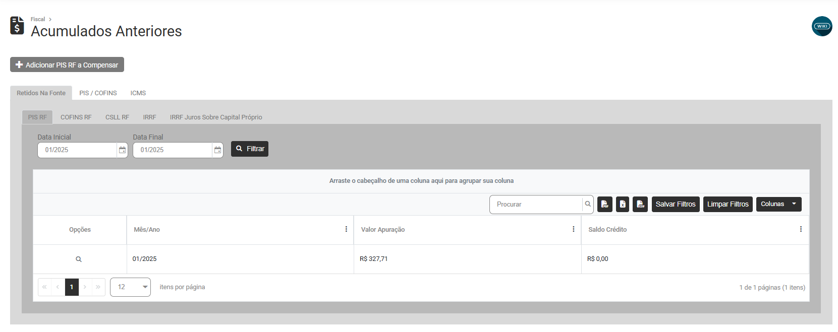 O Sistema irá realizar o cálculo de Acumulados Anteriores automaticamente, mas existem situações (principalmente se você está começando a utilização do sistema) em que esses acumulados anteriores deverão ser informados manualmente, para isso acesse o menu Apuração de Impostos>Acumulados Anteriores