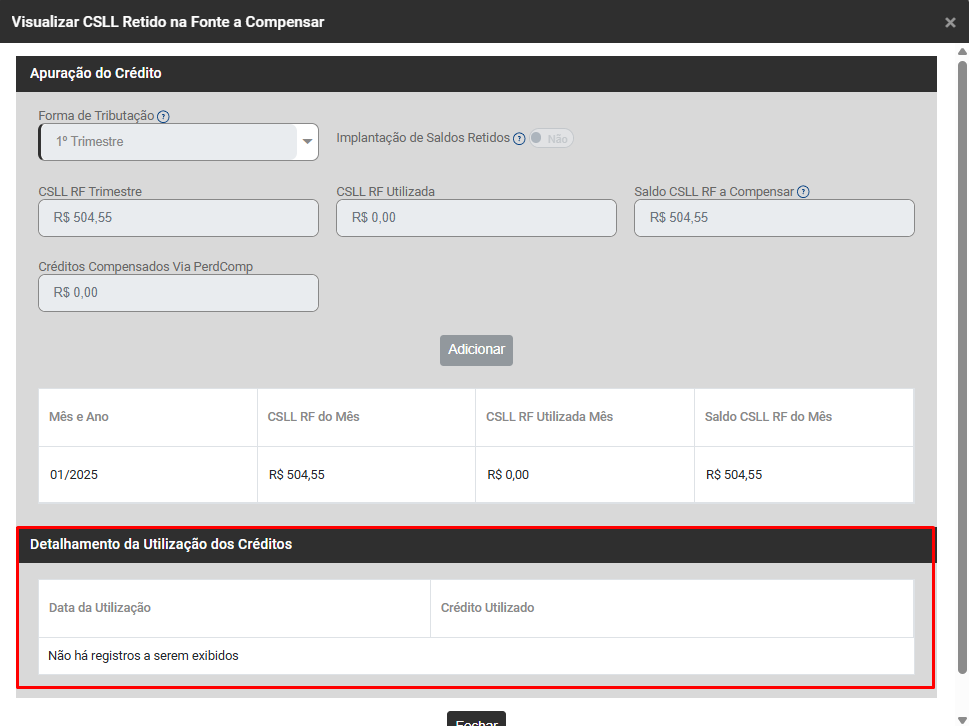• Saldo CSLL RF a Compensar - O Saldo crédito é o resultado da subtração do "CSLL RF Trimestre" e "CSLL RF Utilizada". O saldo de retenção a utilizar em períodos de apuração futuros.