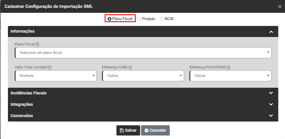 Plano Fiscal - Defina o CFOP que utilizará essas configurações fiscais na importação do XML.