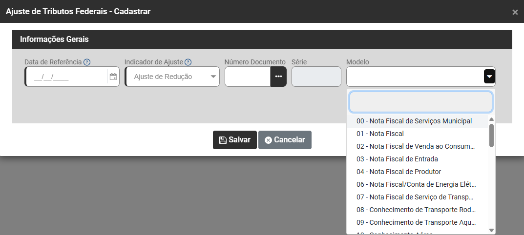 - Modelo da Nota Fiscal que terá o Ajuste de Tributos Federais