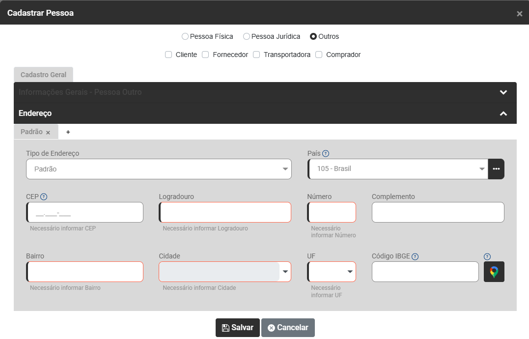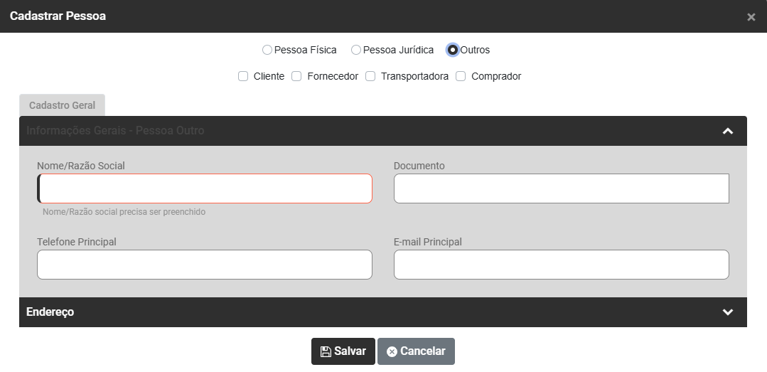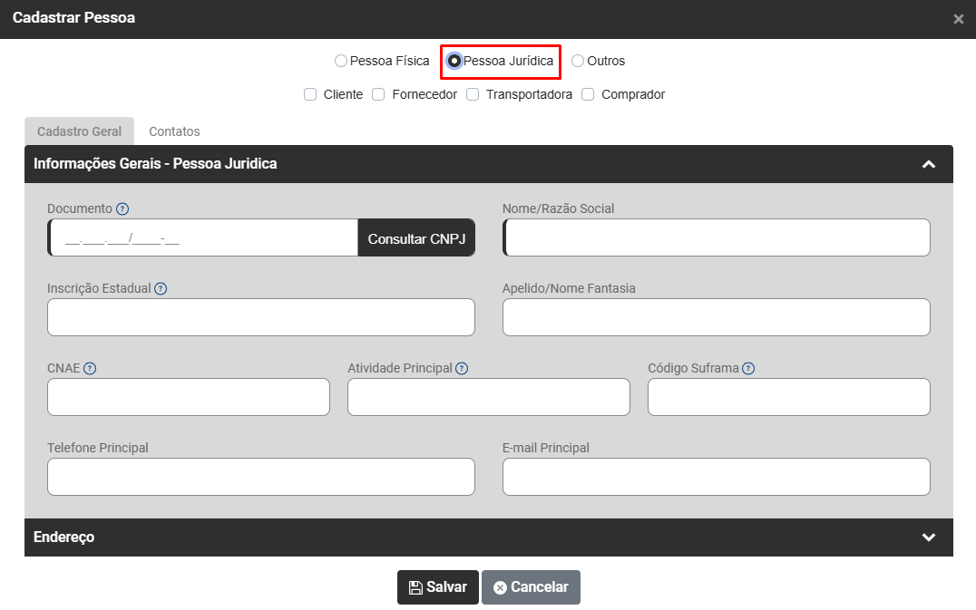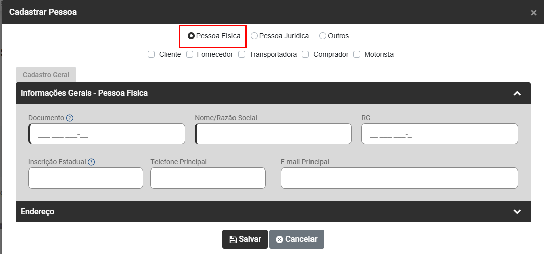 Cadastro de Clientes, Fornecedores e Transportadoras (Pessoa Física, Jurídica ou Outras)