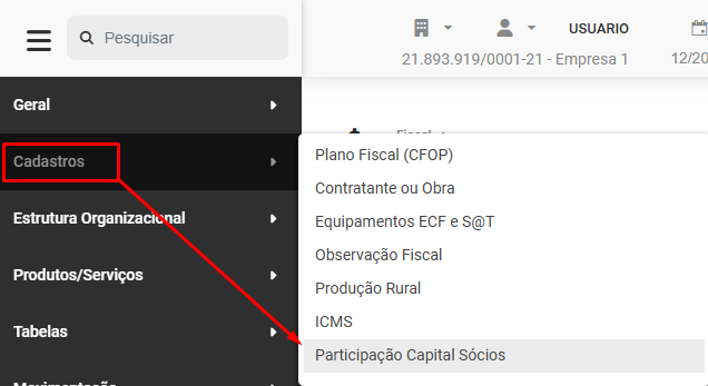 Para cadastrar a Participação dos Sócios no Capital Social da Empresa acesse o menu Cadastros>Participação Capital Sócios