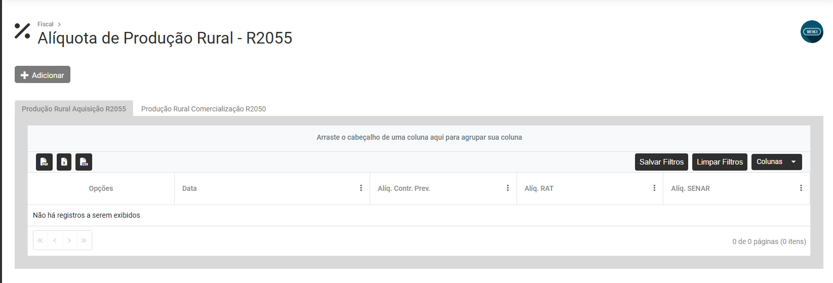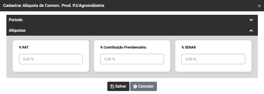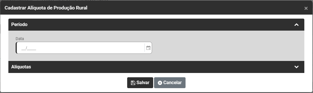 O Sistema trará a tela de Cadastro da Alíquota de Produção Rural, contendo: