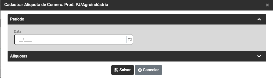 O Sistema trará a tela de Cadastro da Alíquota de Comercialização Produtos PJ/Agroindústria, contendo: