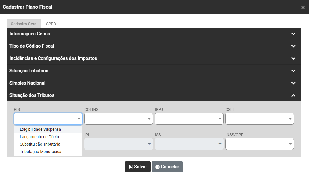 O Sistema apresentará a lista dos CFOPs que você selecionou anteriormente,, confirme selecionando os CFOPs e clique em Salvar Planos Fiscais