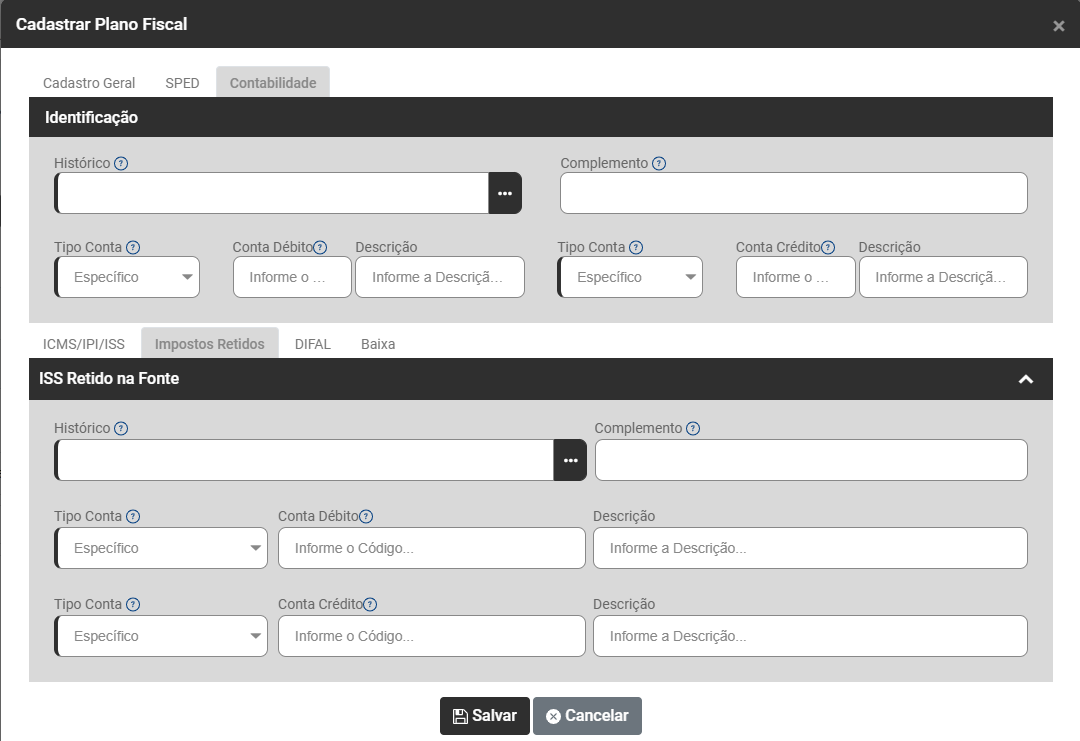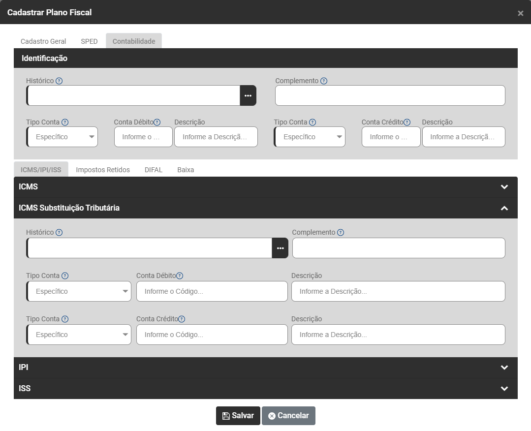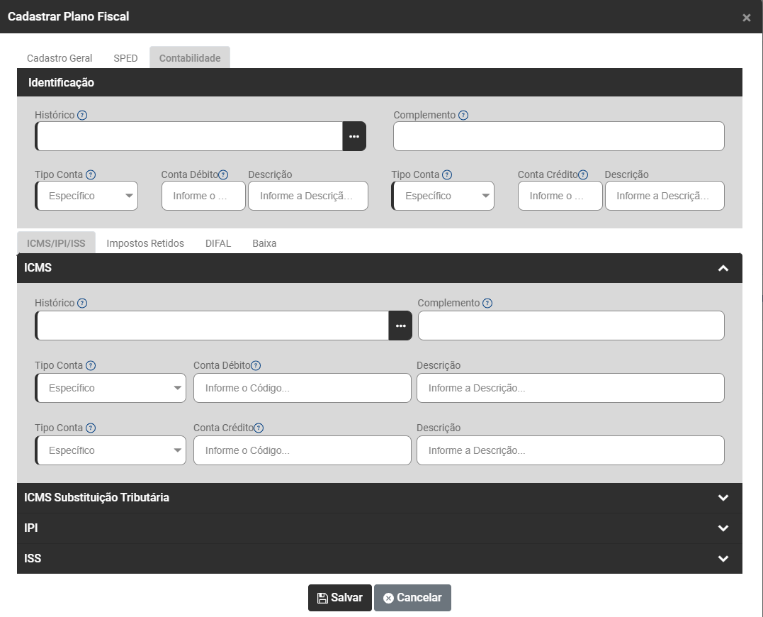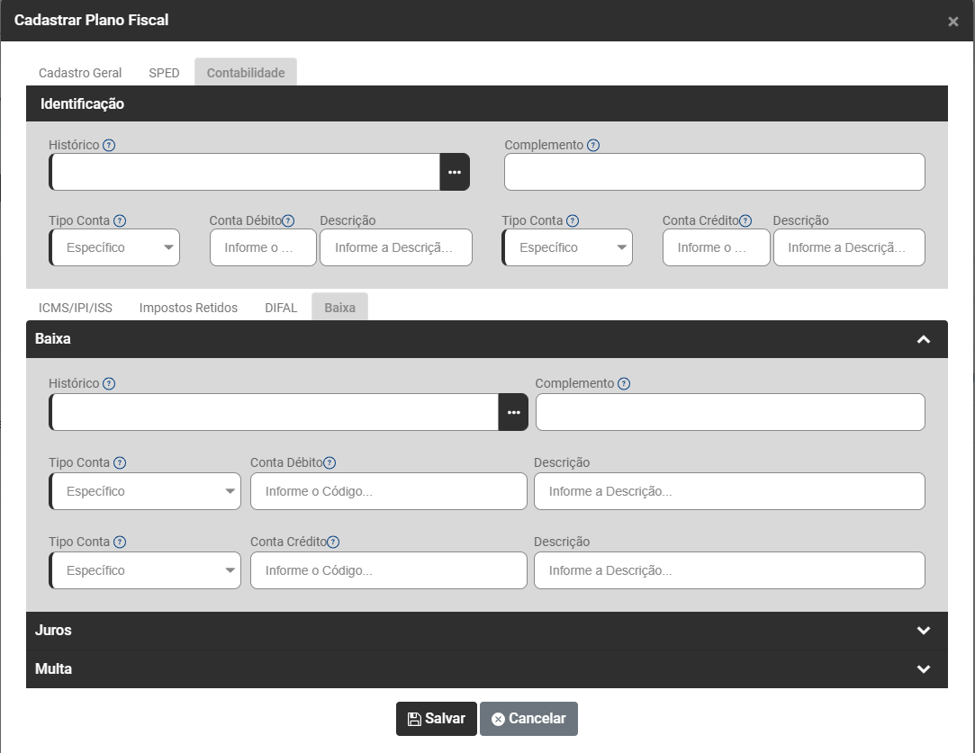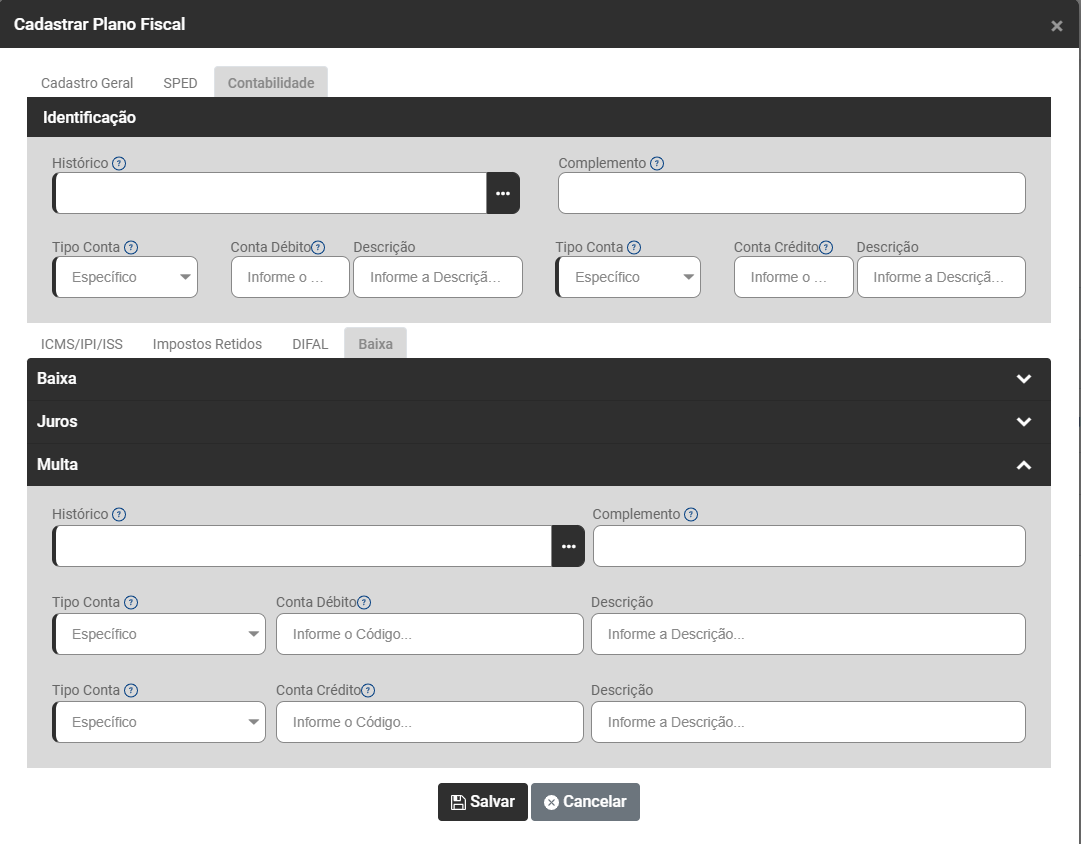 - Histórico - Defina o histórico que será exportado para o Valor Contábil na integração com a contabilidade.