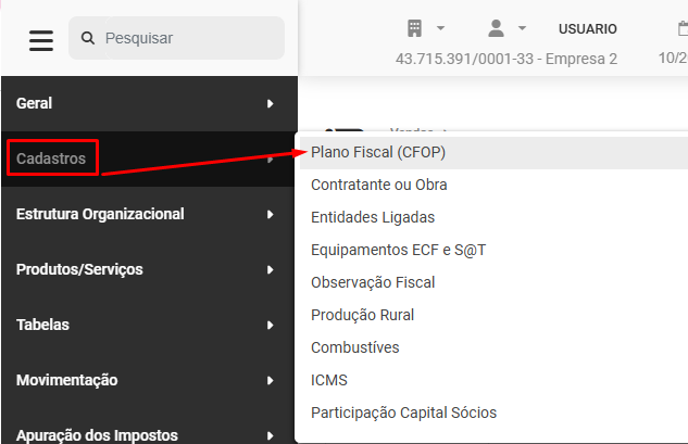 Para cadastrar o Plano Fiscal de sua Empresa, contendo os CFOPs que são utilizados, acesse o menu Cadastros>Plano Fiscal (CFOP)