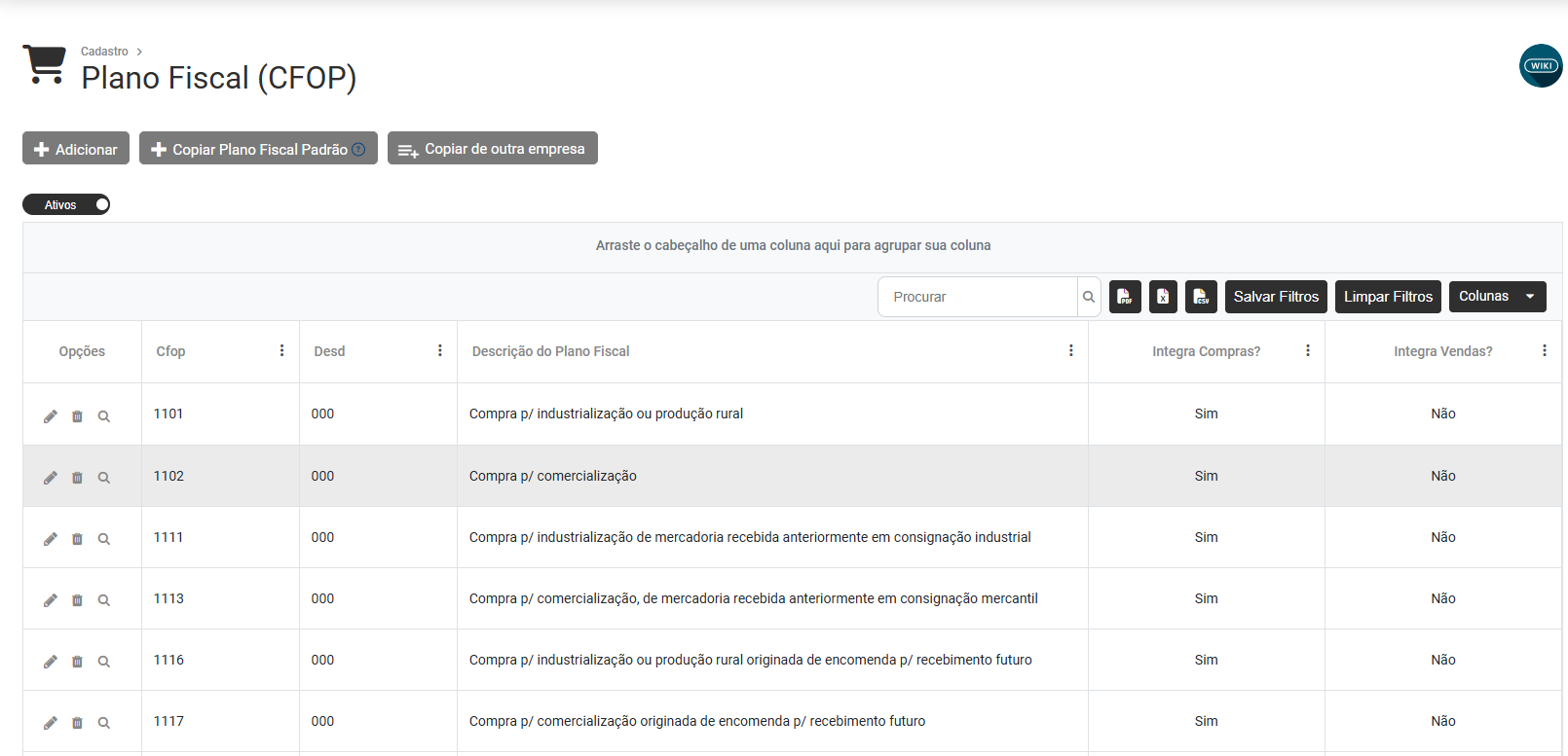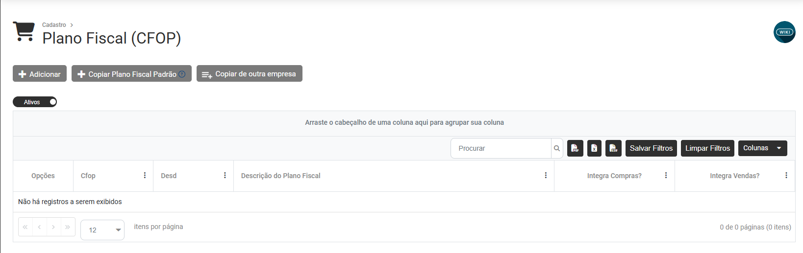 Na parte superior da Tela você encontrará 3 formas para o cadastro do Plano Fiscal de sua Empresa - Adicionar, Copiar Plano Fiscal Padrão e Copiar de outra empresa