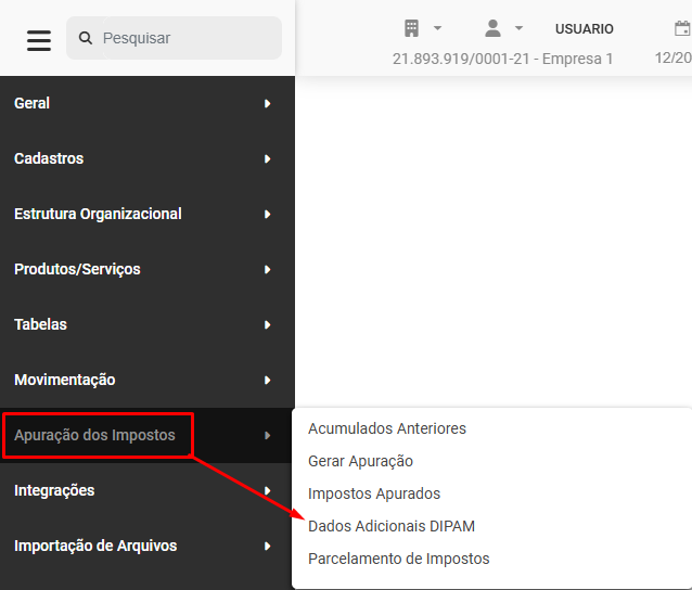 Para cadastrar os Dados Adicionais da DIPAM (Declaração para o Índice de Participação dos Municípios), acesse o menu Apuração dos Impostos>Dados Adicionais DIPAM