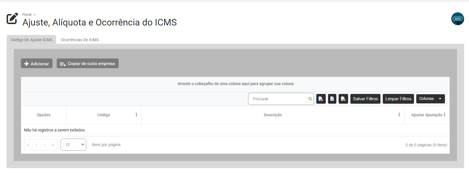 b) clique no botão Copiar de Outra Empresa para copiar o cadastro do Código de Ajuste ICMS de uma outra Empresa