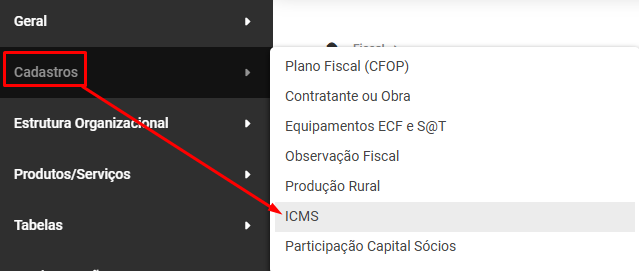 Para cadastrar os Ajustes, Alíquotas e Ocorrências do ICMS, acesse o menu Cadastros>ICMS