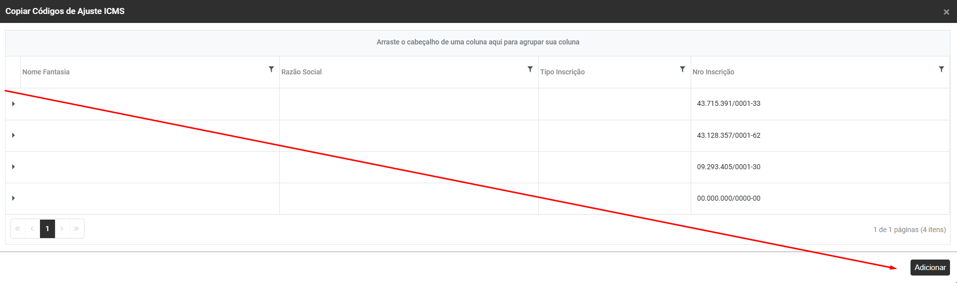 Ao clicar no botão, serão apresentadas as empresa, pesquise pela empresa que já possui o Código de Ajuste ICMS cadastrado, expanda as informações da empresa, selecione o código de ajuste e clique em Adicionar