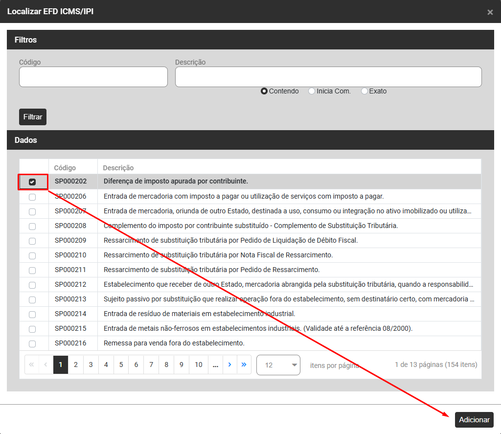 Ao clicar no DLG (três pontinhos) serão apresentados os Códigos de Ajuste, defina qual é o código e clique em Adicionar