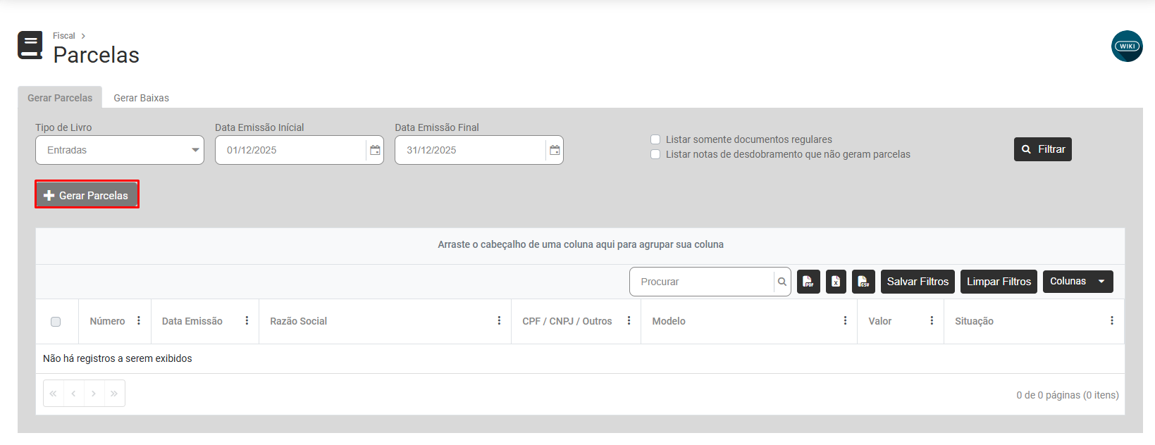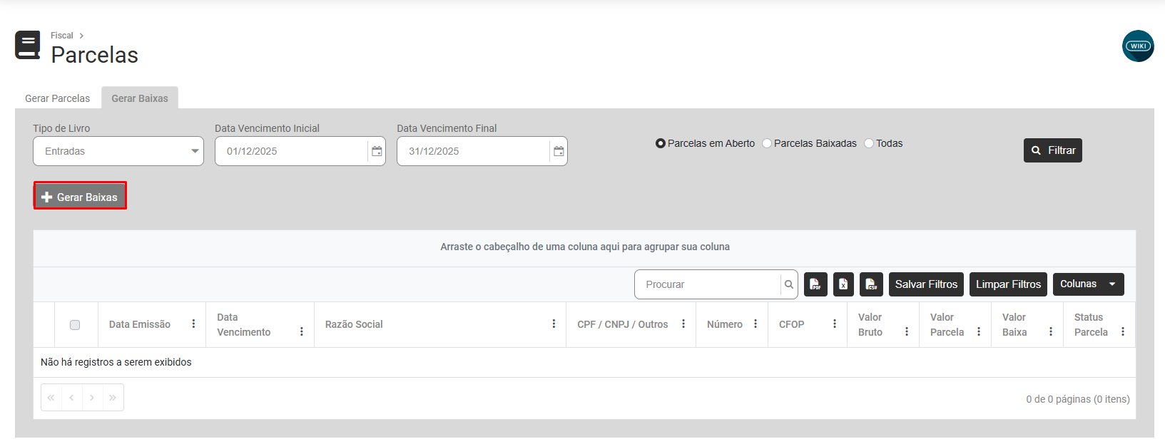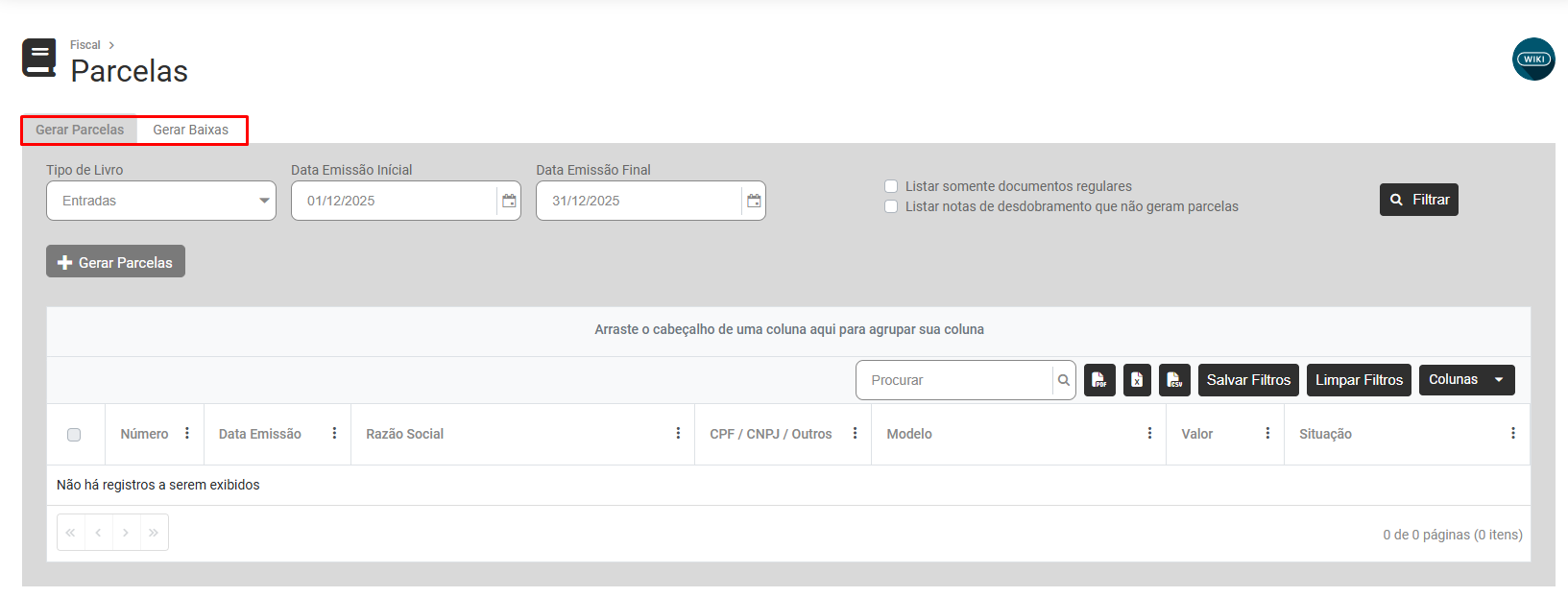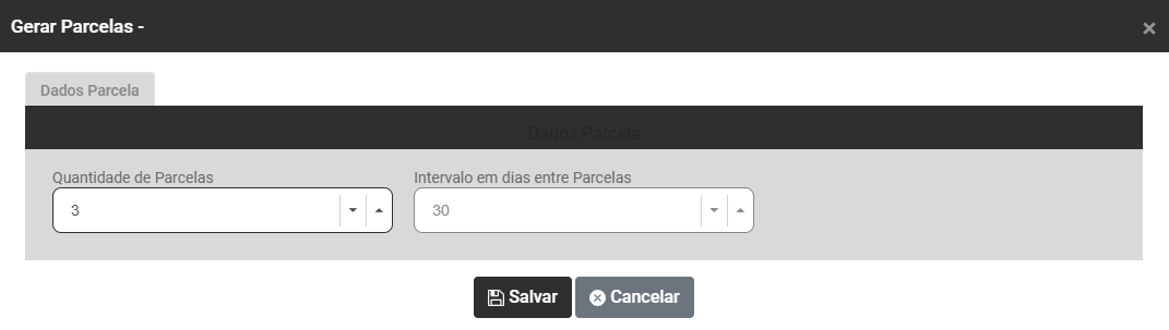 Na tela apresentada você verá duas abas - Gerar Parcelas e Gerar Baixas