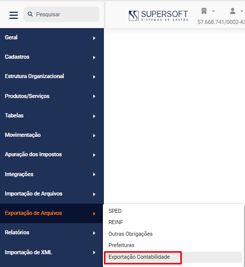 Para realizar a Exportação de Arquivos para a Contabilidade acesse o menu Exportação de Arquivos>Exportação Contabilidade