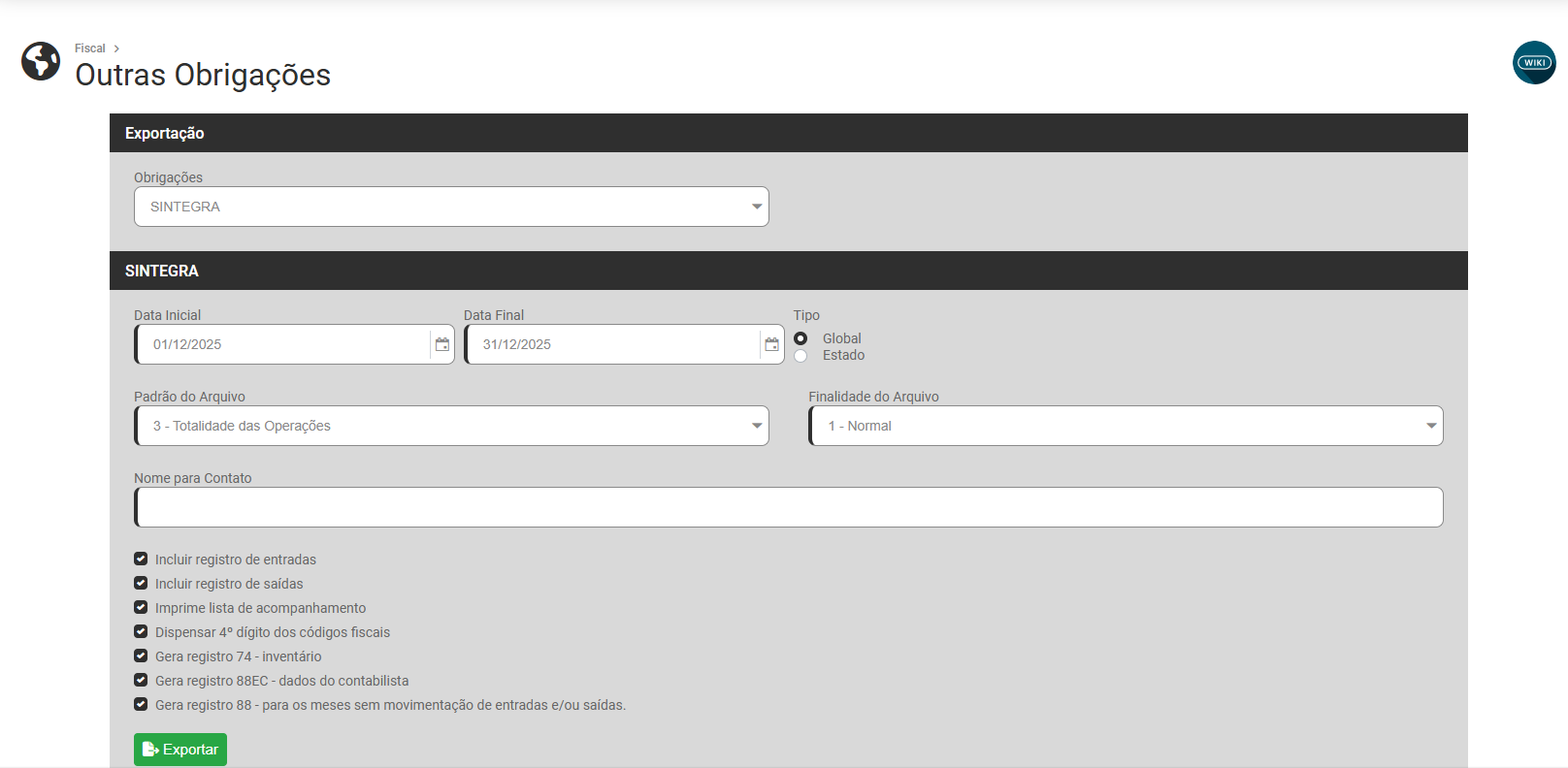 Faça a configuração para a geração do arquivo e clique no botão Exportar