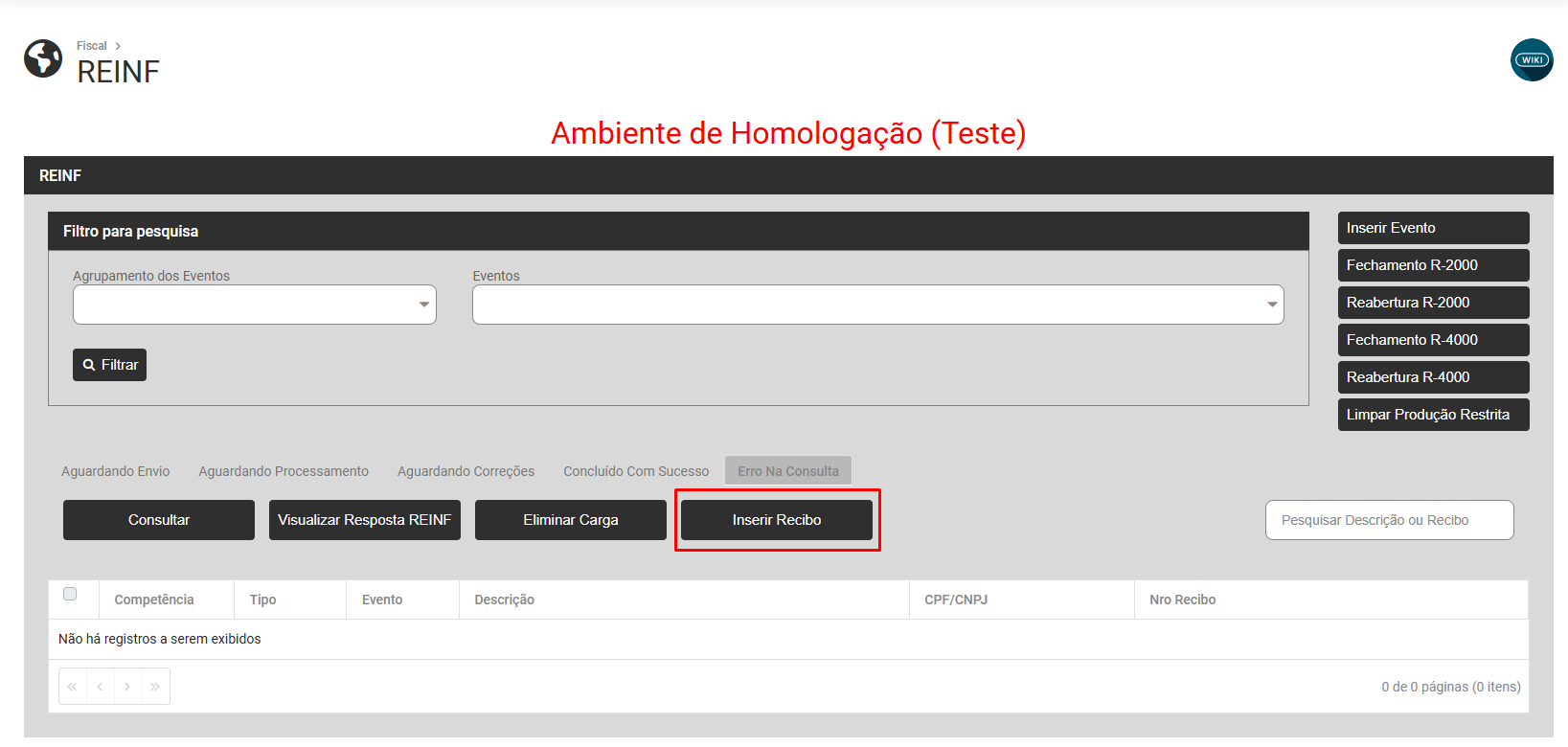 Na aba Erro na Consulta temos também o botão Inserir Recibo, que será utilizado se o evento já foi transmitido e deu erro na consulta, desta forma, selecione o evento, clique em Inserir Recibo e cole o número do Recibo do mesmo