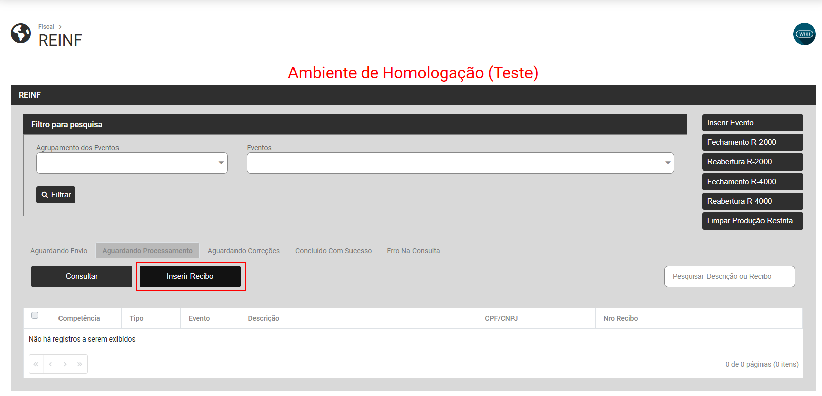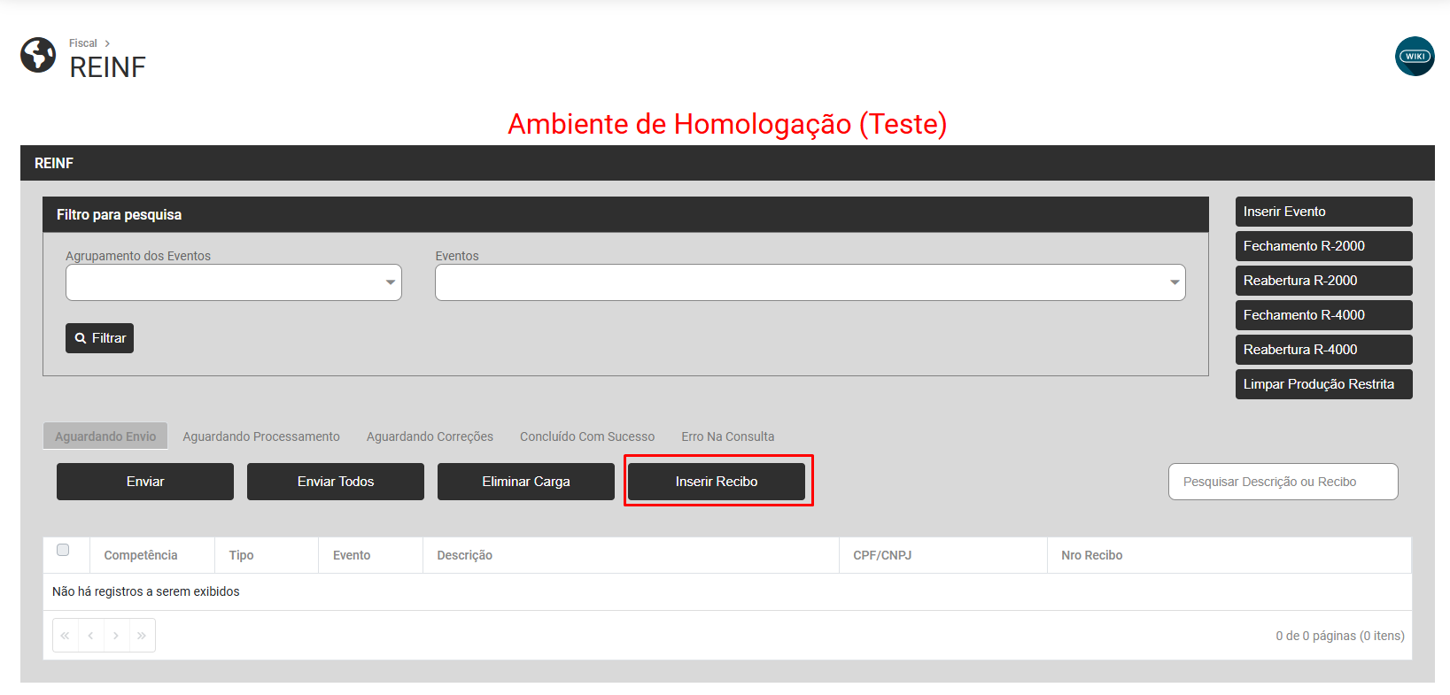 Na aba Aguardando Envio temos também o botão Inserir Recibo, que será utilizado se o evento já foi transmitido, desta forma, selecione o evento, clique em Inserir Recibo e cole o número do Recibo do mesmo