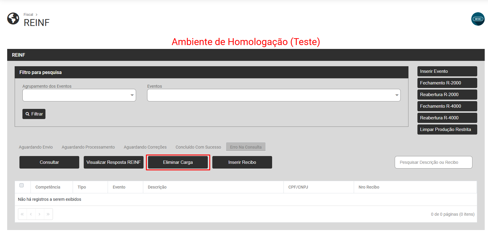 Se o evento que você envio para a REINF apresentou Erro na Consulta você poderá eliminar a carga, selecione o evento e clique no botão Eliminar Carga