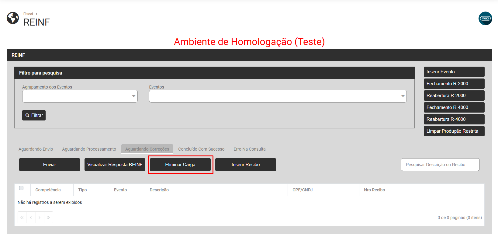 Se o evento que você envio para a REINF apresentou rejeição você poderá eliminar a carga, selecione o evento e clique no botão Eliminar Carga