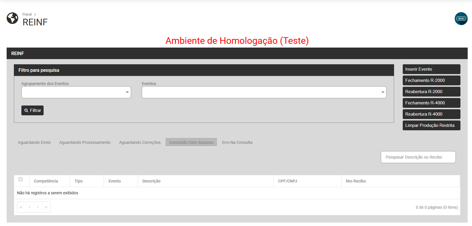Nesta aba estarão listados todos os eventos que foram enviados para a REINF e que foram Concluídos com Sucesso