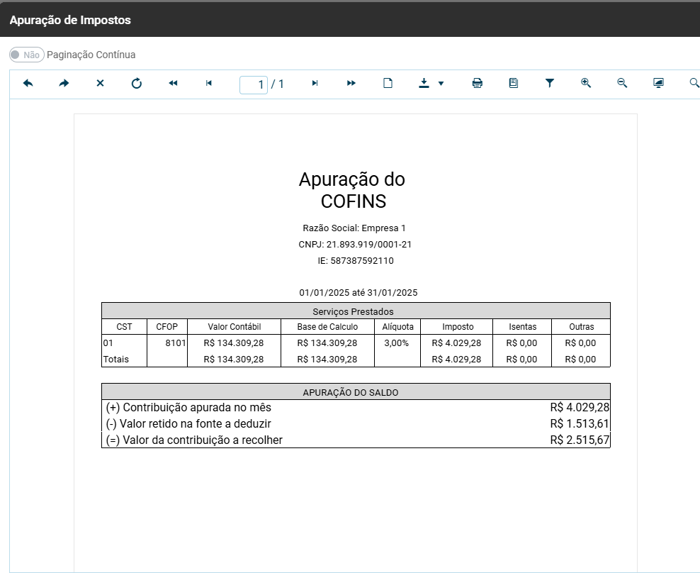 O Sistema apresentará as informações para a Apuração do Imposto definido