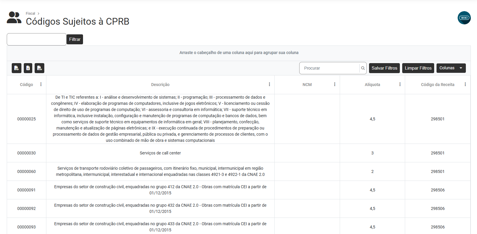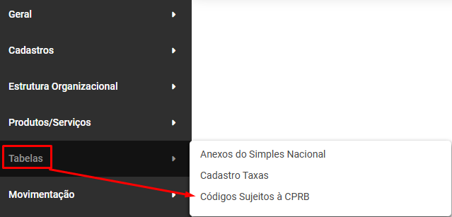 Para visualizar o Cadastro dos Códigos Sujeitos a CPRB acesse o menu Tabelas>Códigos Sujeitos a CPRB