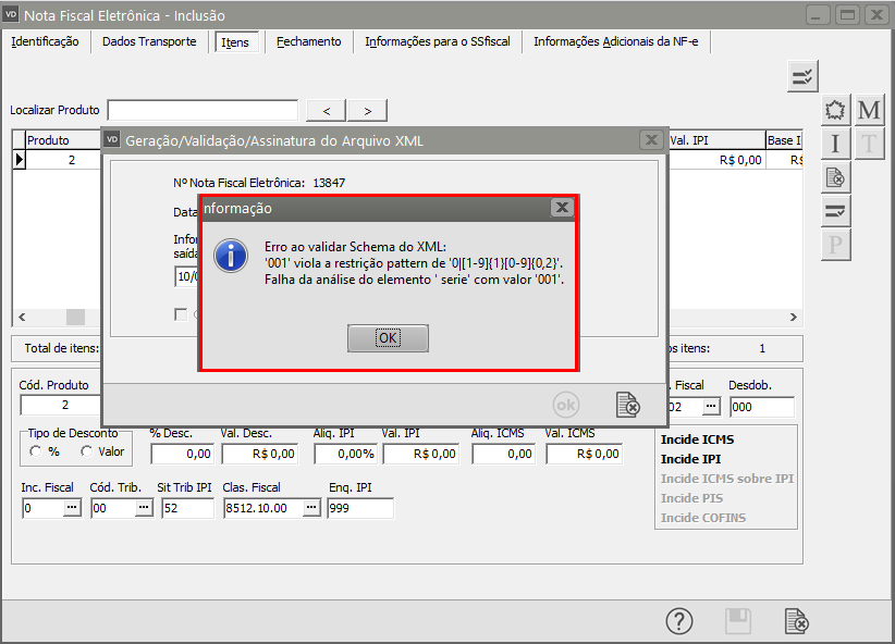 Ao validar Schema do XML:'001' viola a restrio pattern de '0|[1-9]{1}[0-9]{0,2}'. Falha da anlise do elemento ' serie' com valor '001'.