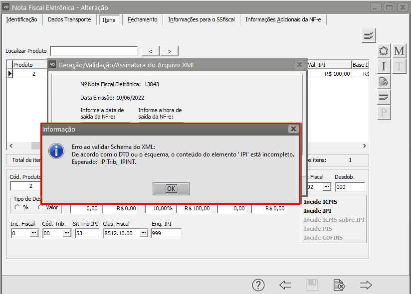 De acordo com o DTD ou o esquema, o conteúdo do elemento ' IPI' está incompleto. Esperado: IPITrib, IPINT