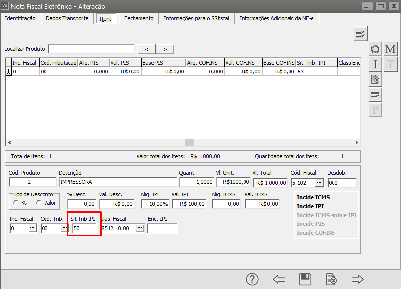Acesse a aba Itens e verifique qual foi o Código de Situação Tributária de IPI informado (existem código que obrigam informar a aliquota e valor de IPI e outros códigos que não permitem que essas informações sejam cadastradas).
