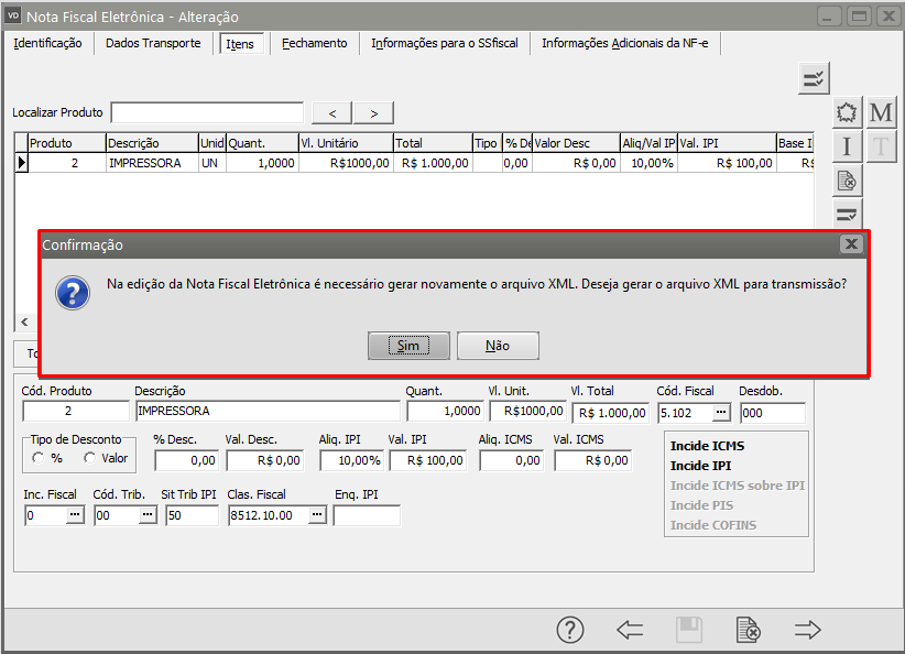 Após realizada a correção Salve a NF-e e o Sistema irá questionar se você deseja que seja gerado o novo XML, clique em SIM.