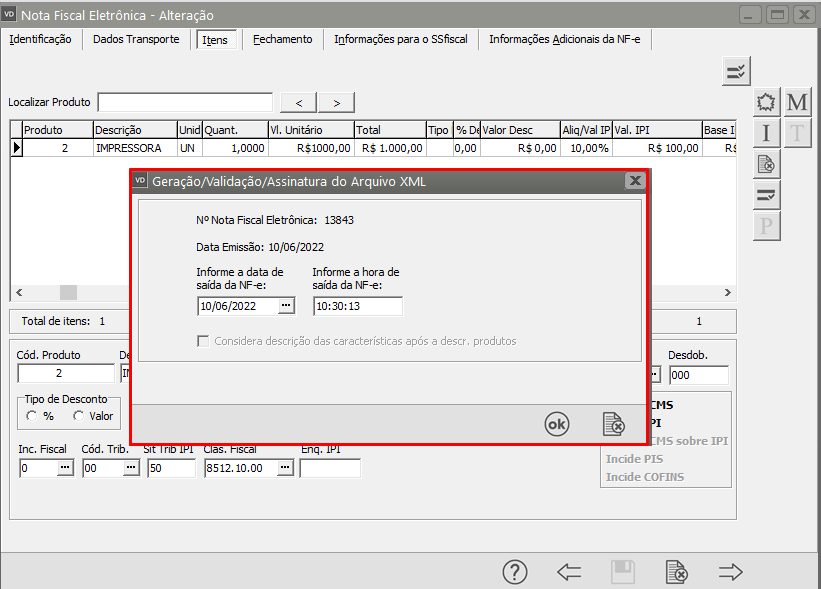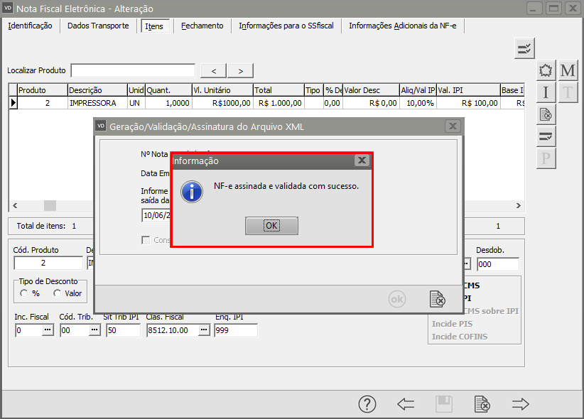 Se todas as informações estiverem corretamente cadastradas a NF-e será assinada e validada com sucesso.