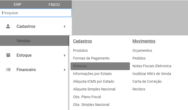 Em seguida acesse o Cadastro do Cliente (destinatário da nota fiscal eletrônica que foi rejeitada), no menu Vendas>Pessoas